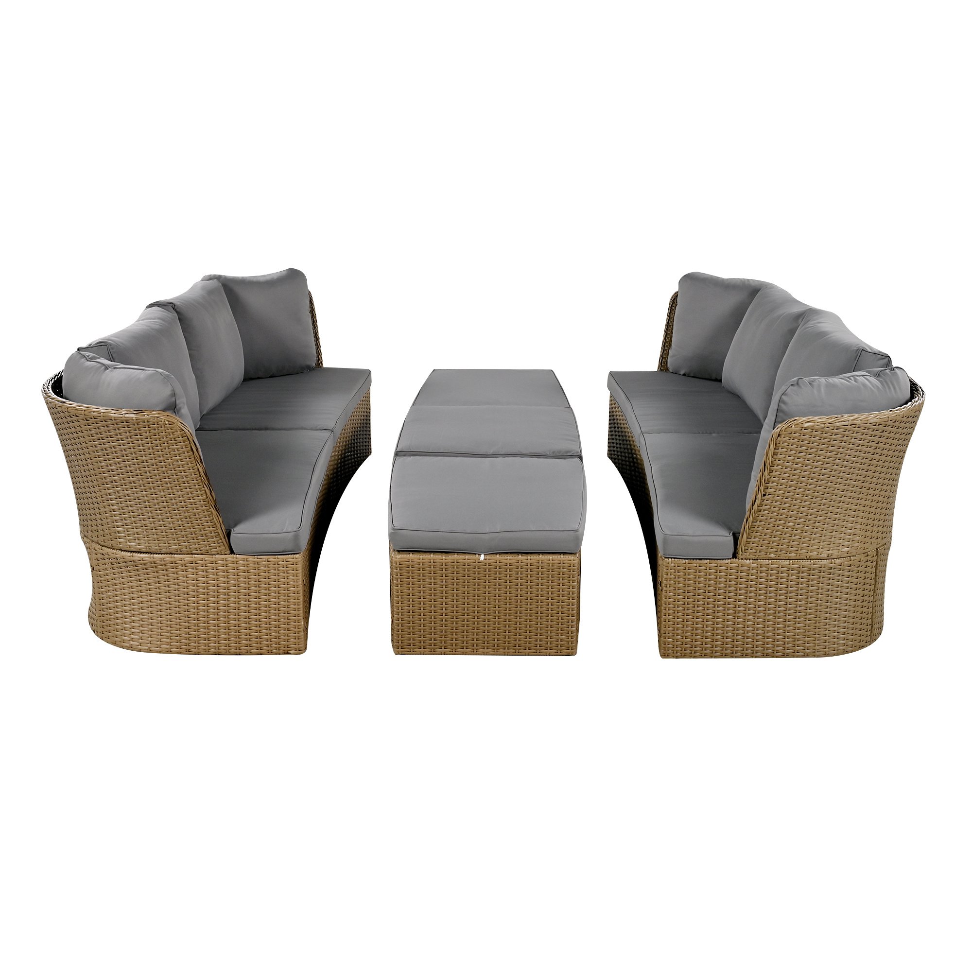 [Central Coffee Table]: Accompanied by a central coffee table, this set enhances functionality and convenience for gatherings and relaxation. The adjustable feature of the coffee table adds versatility to the outdoor space.